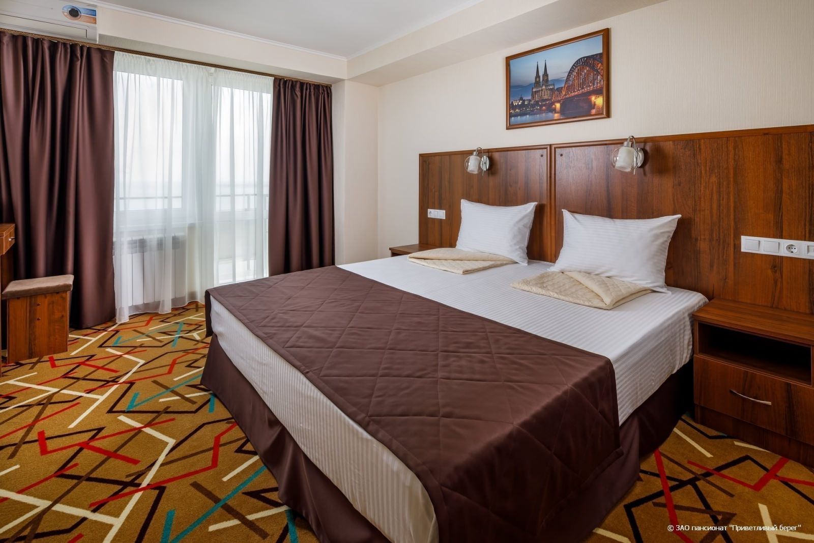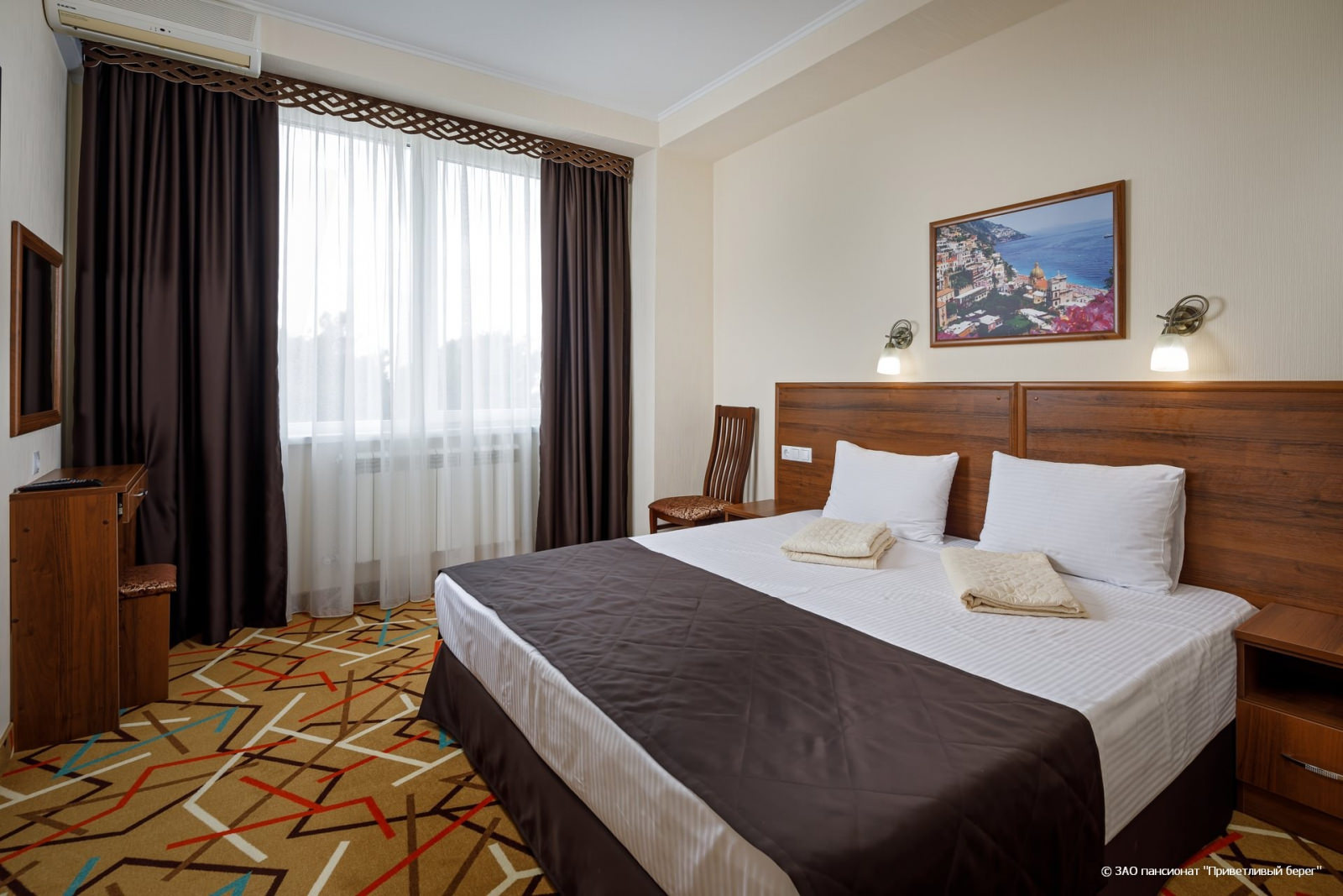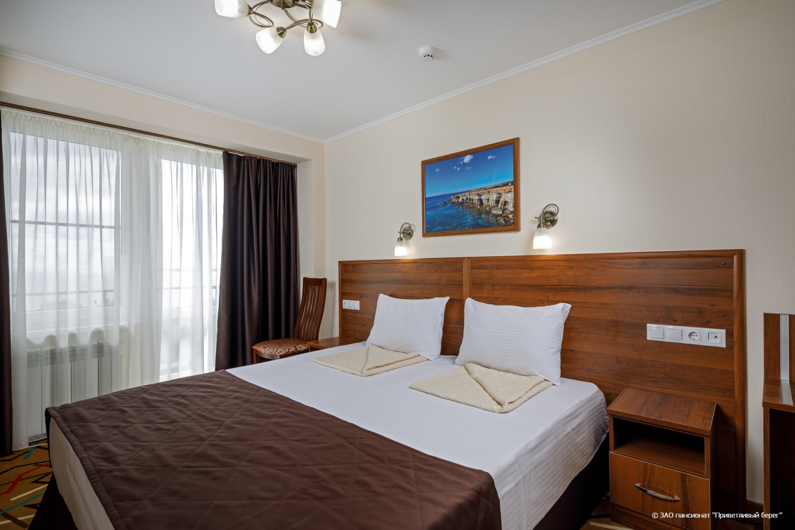 Современное 17-этажное здание пансионата имеет номерной фонд на 512 мест. Из окон каждого номера открывается живописный вид на бухту и горы. Для проживания отдыхающим предложат номера категорий Стандарт 2-местный, Семейный 2-местный 2-комнатный и Семейный Комфортный 2-местный 2-комнатный обладающие всеми необходимыми удобствами.
